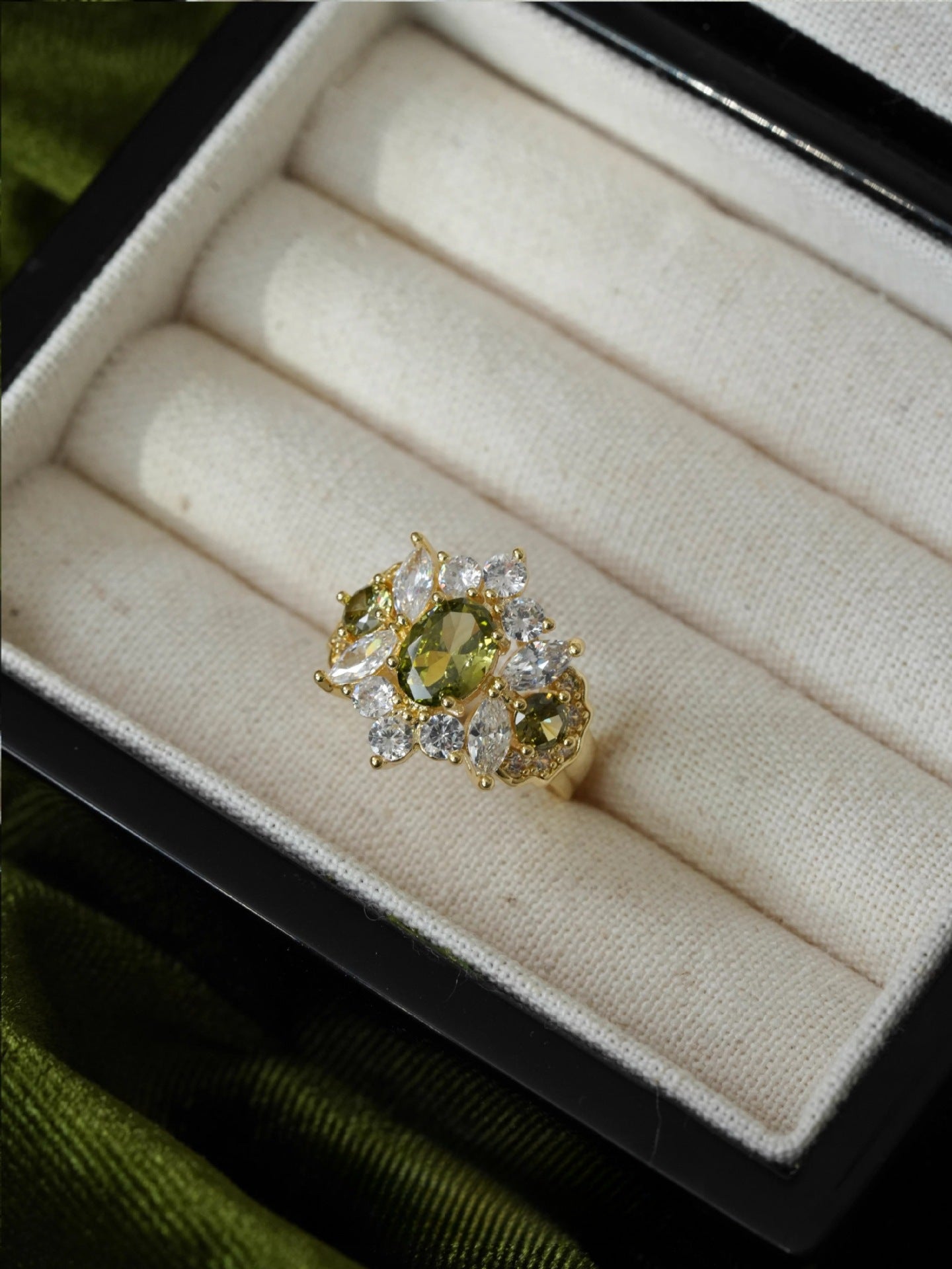 Handcrafted in premium copper, this French retro palace-style masterpiece features an olive-green zircon centerpiece, encircled by dazzling white stones that shimmer with every movement. The floral arrangement evokes elegance and regality — a piece that feels both royal and romantic.