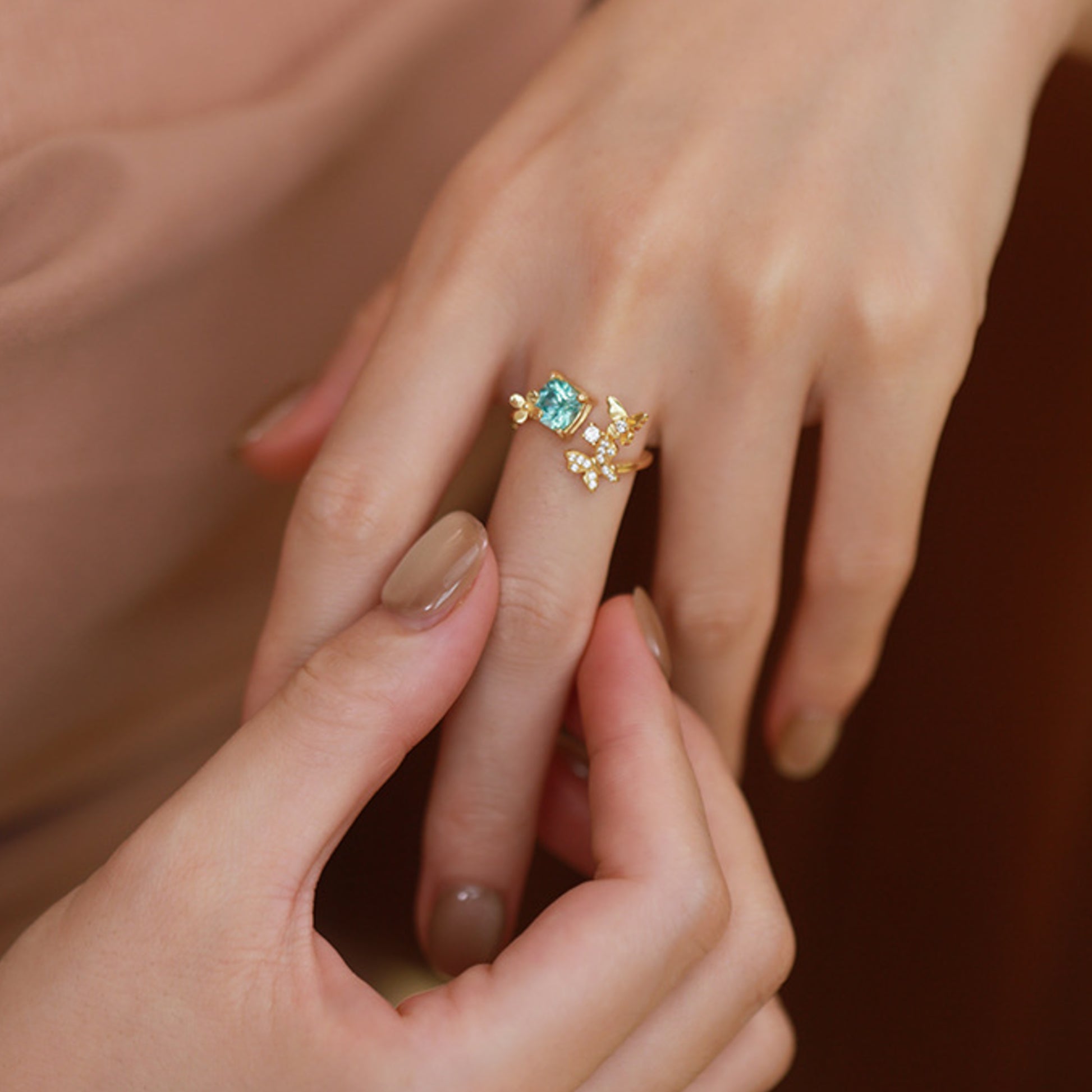 - Stone Detail: Square-cut central stone with micro zircon butterfly accents