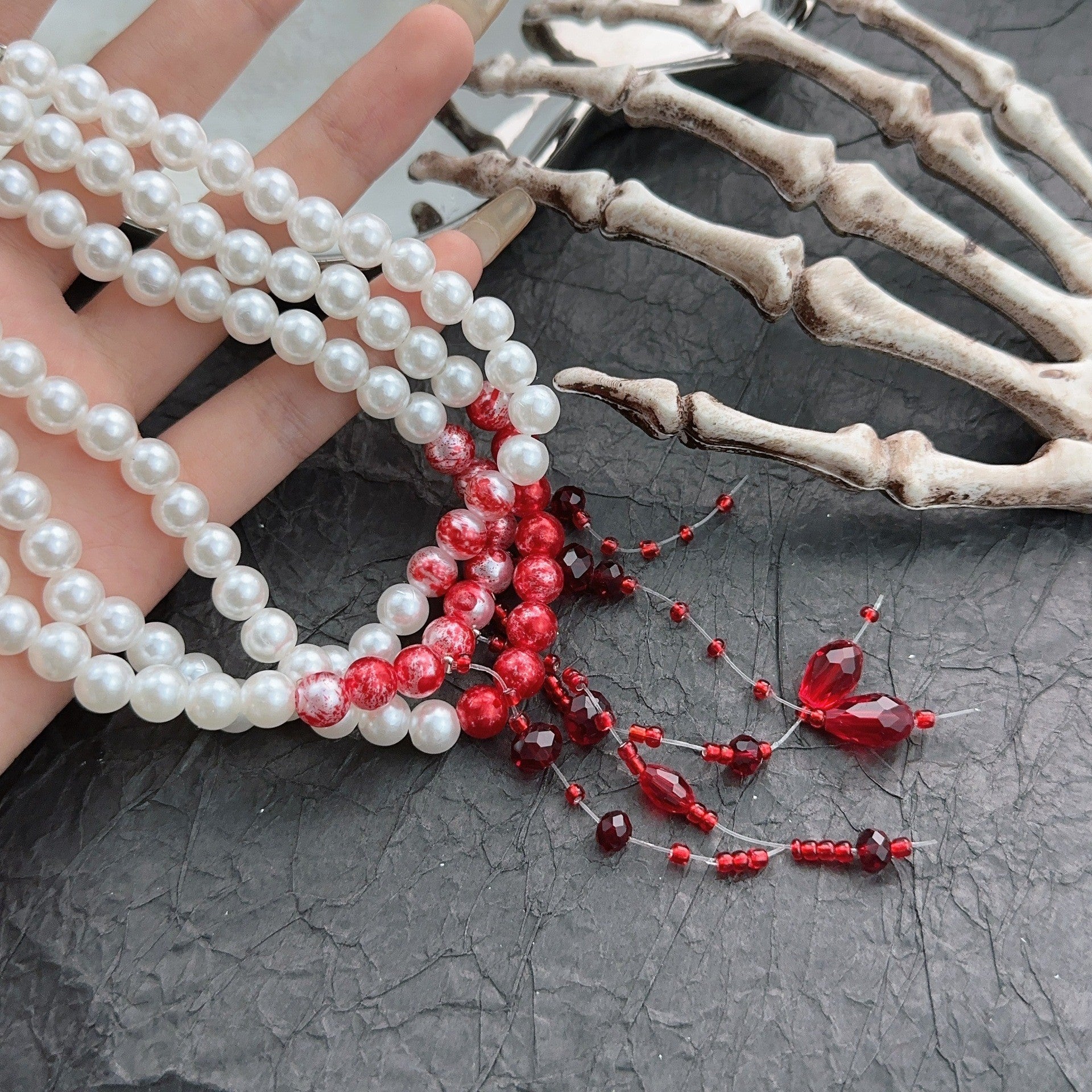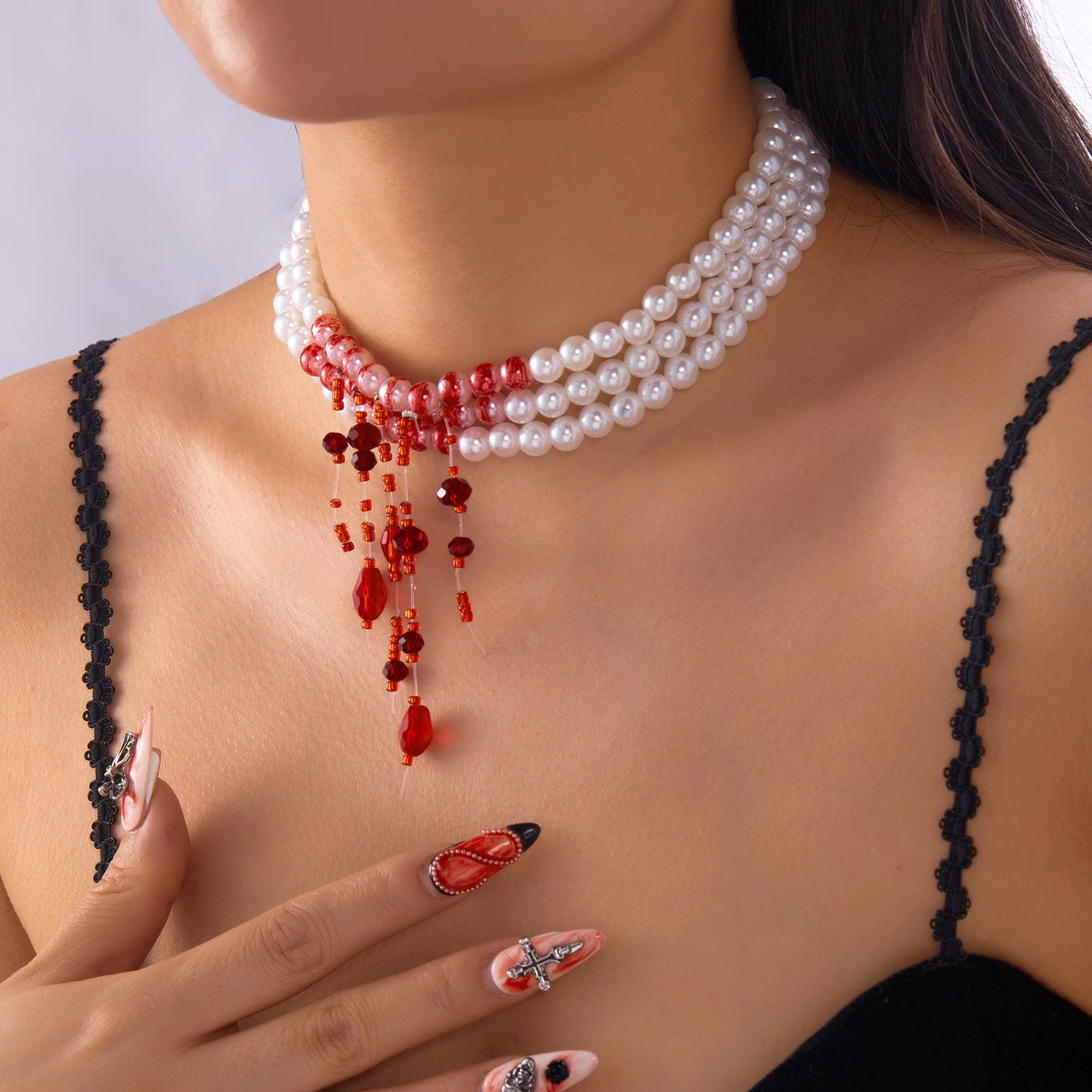 Crafted with premium artificial pearls, this piece embraces your neckline with sophistication while the red crystal droplets add an irresistible edge. Designed for those who dare to blend classic beauty with daring charm.