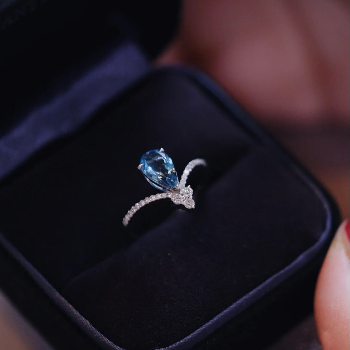 The Blue Mirage Teardrop Ring captures the stillness of an ocean sky — where soft light meets calm depth. Featuring a luminous aquamarine teardrop stone nestled in a crown-like curve and surrounded by micro zircons that shimmer like dew, it’s a piece that brings subtle elegance to every gesture.