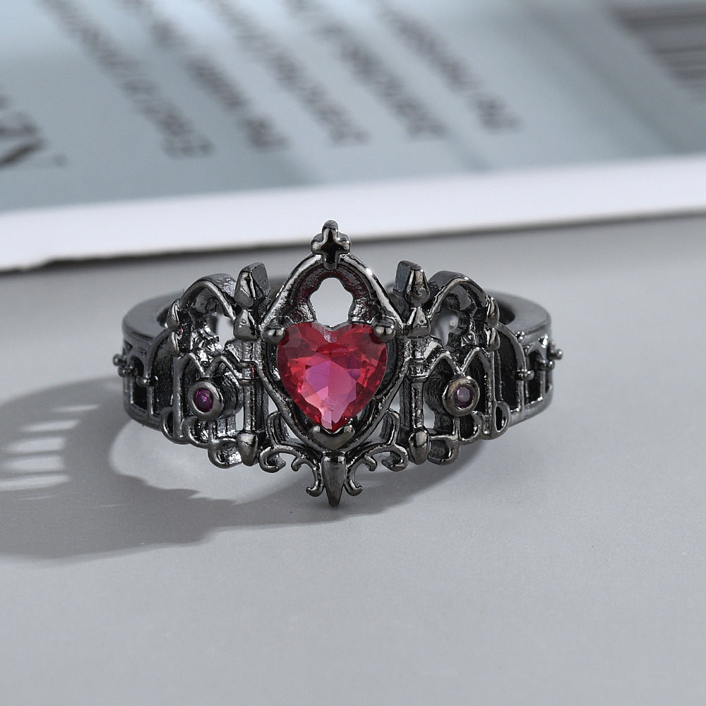 The Crown of the Monarch Ring is a gothic masterpiece sculpted from premium copper alloy, featuring a raspberry heart-cut stone nestled within a regal crown frame. Every intricate detail — from the dark metallic carvings to the miniature cross accents — evokes power, mystery, and elegance worthy of a dark ruler.