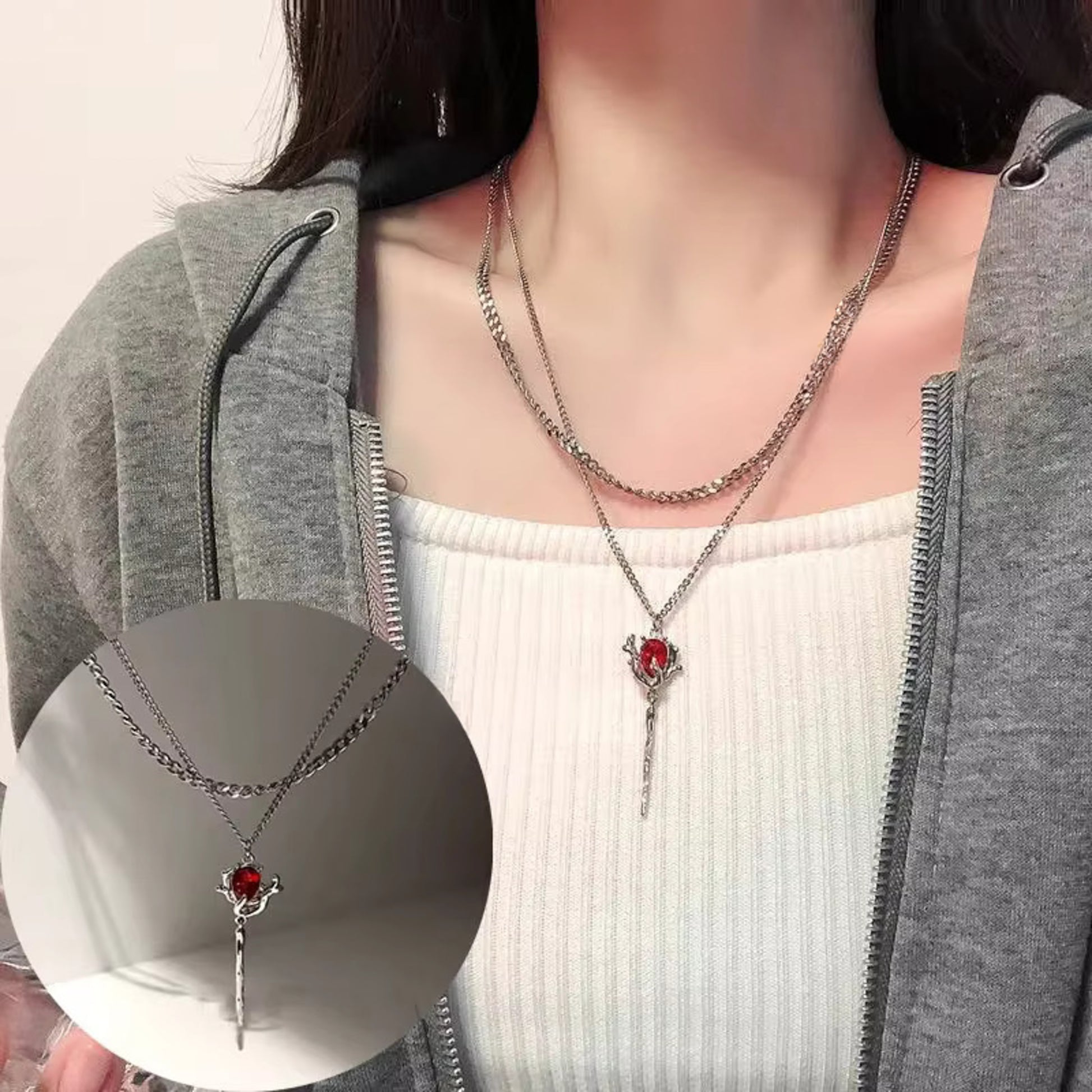 The Rose in Thorne Necklace captures the essence of gothic romance — a fiery red heart blooming within silver thorns. Crafted with a deep red gemstone framed by fluid metallic stems, this design symbolizes love that burns beyond time. Its double-layered cross chain adds a bold edge, perfect for those who live unapologetically in style and emotion.
