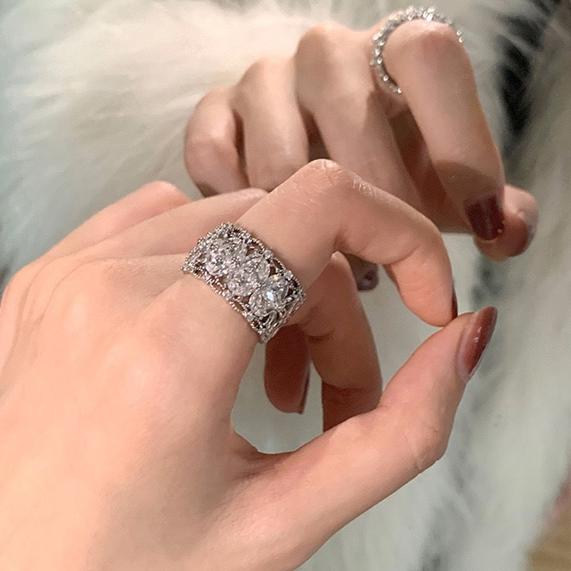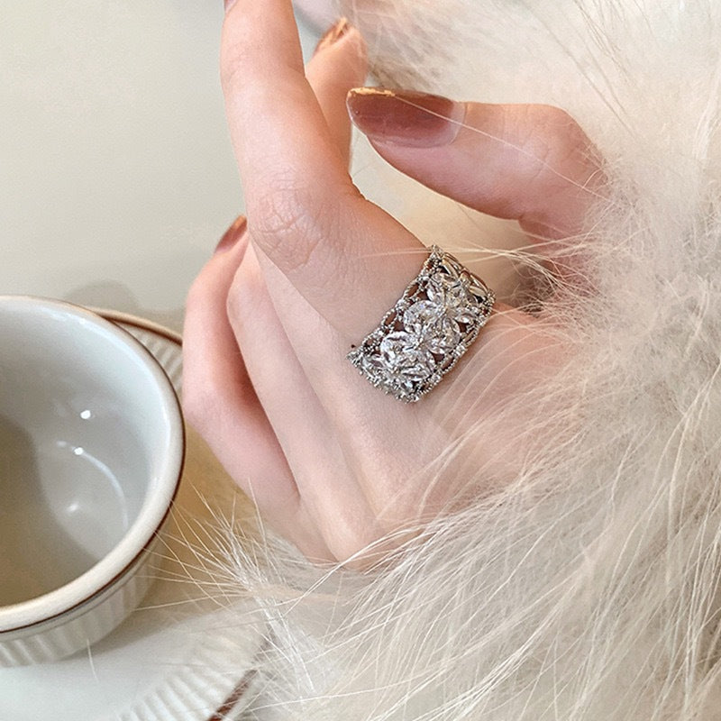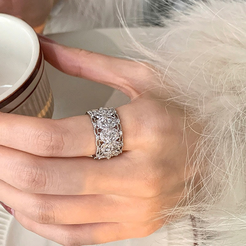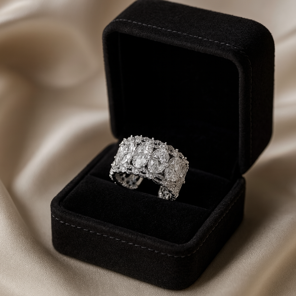 The Diamond Dahlia Ring captures the essence of eternal elegance through its intricate floral lattice, set with dazzling silver zircons that catch light from every angle. Crafted from high-quality copper and finished in a polished silver tone, this wide-band statement ring merges sophistication with romantic artistry — perfect for the woman who carries grace like second nature.