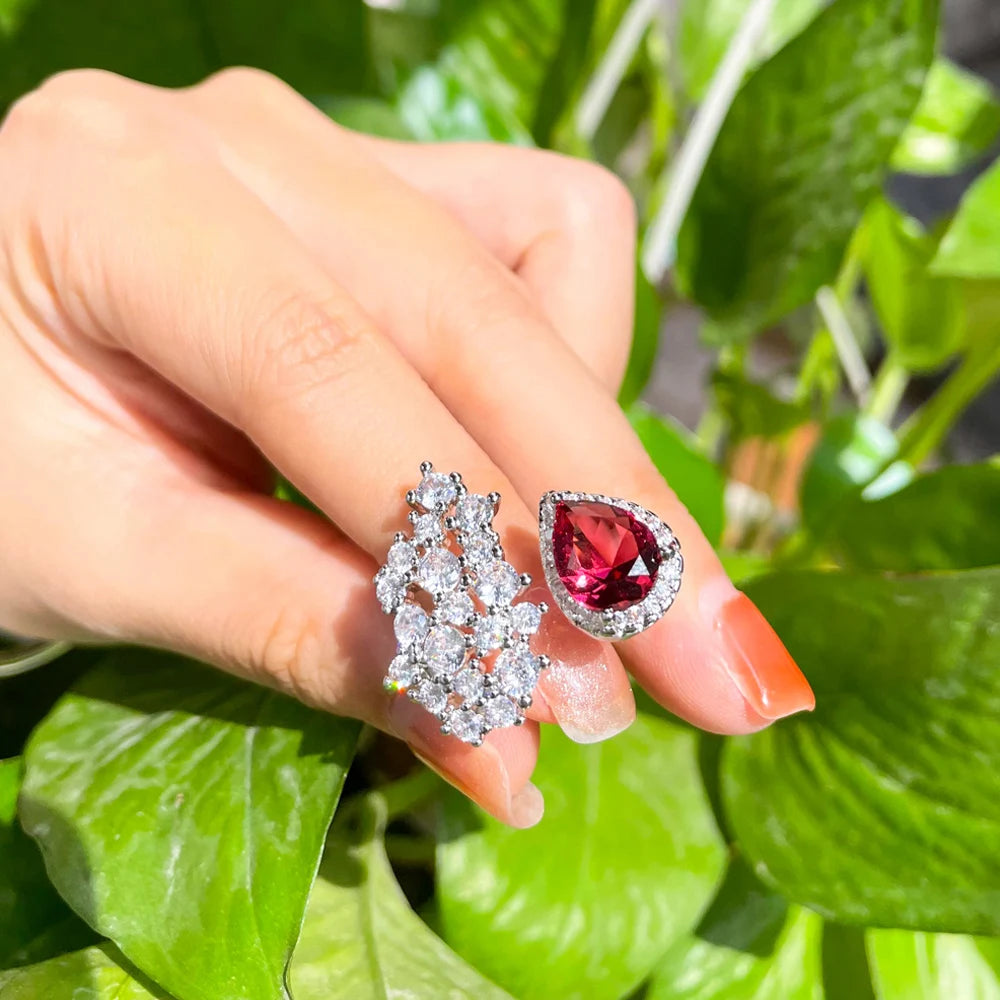 Its stunning ruby red teardrop zircon, surrounded by a halo of micro-crystals, glimmers like a drop of passion caught in light. Crafted from premium brass and electroplated stainless steel, this open adjustable ring blends strength with refined femininity.