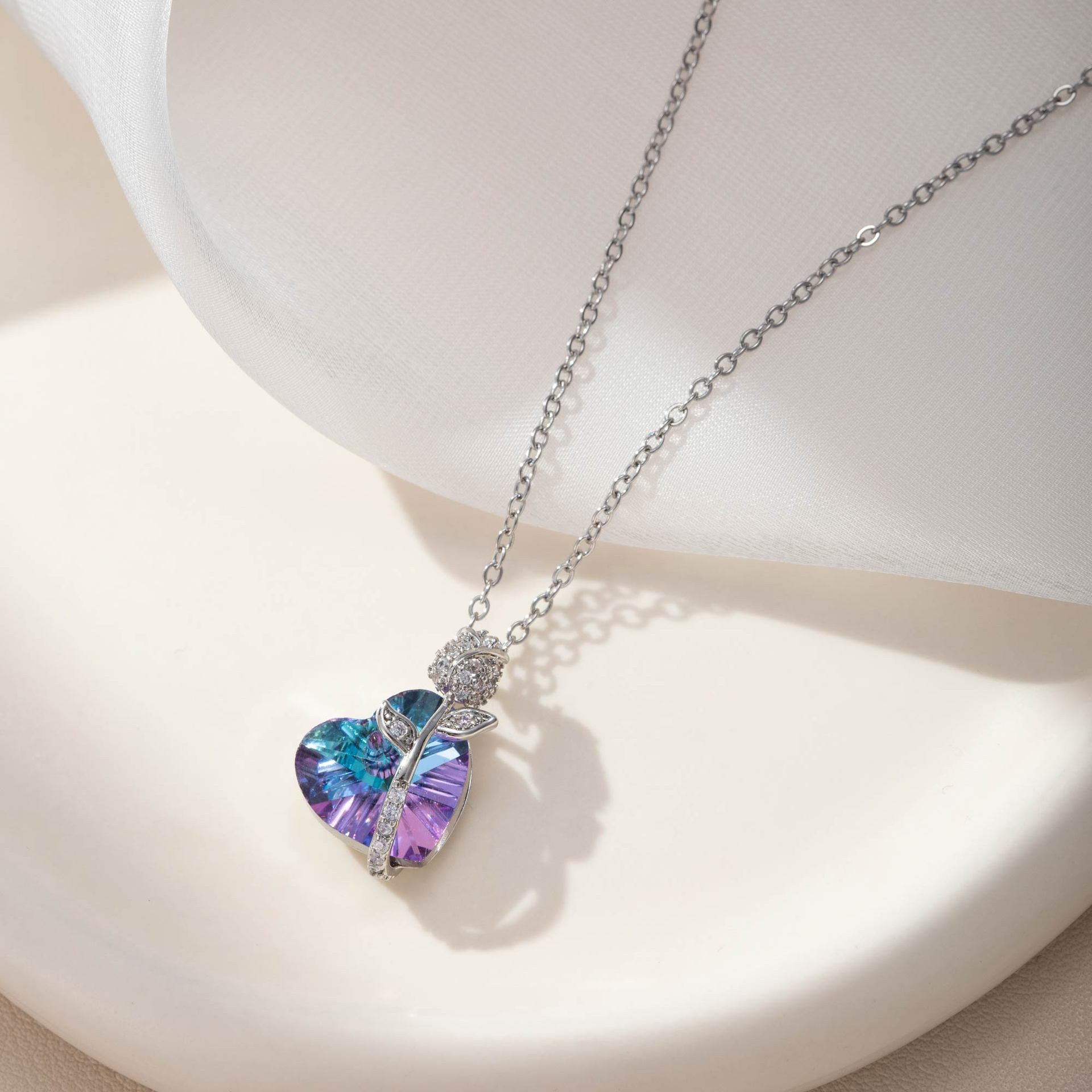 Crafted with elegance and emotion, the Lavender Lovebloom Necklace features a dazzling heart-shaped artificial crystal pendant in soft shades of lavender, violet, and ocean blue, embraced by a delicate floral vine and shimmering crystal accents.