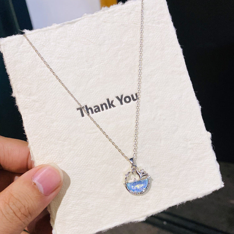 - Stone Detail: Ocean-blue half moon stone with silver tail + zircon & rhinestone detailing