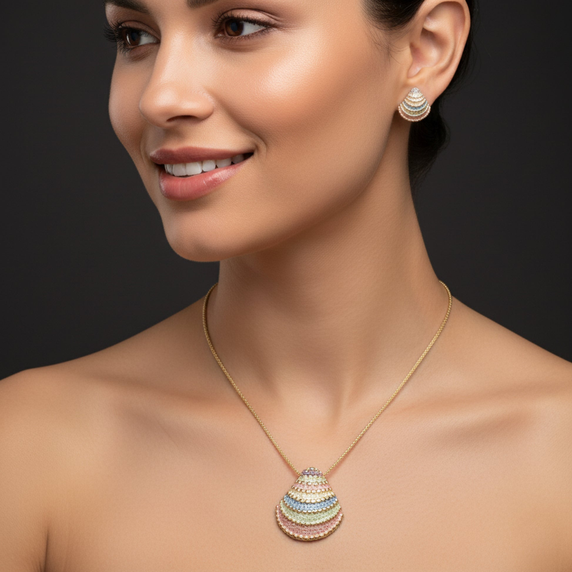 Soft, serene, and full of seaside charm — the Pastel Dreams Set captures the beauty of ocean waves painted in morning light. Crafted from premium alloy with a radiant pastel palette of pink, blue, and champagne tones, this elegant set includes a shell pendant necklace and matching earrings that shimmer like coral reflections beneath the sun.