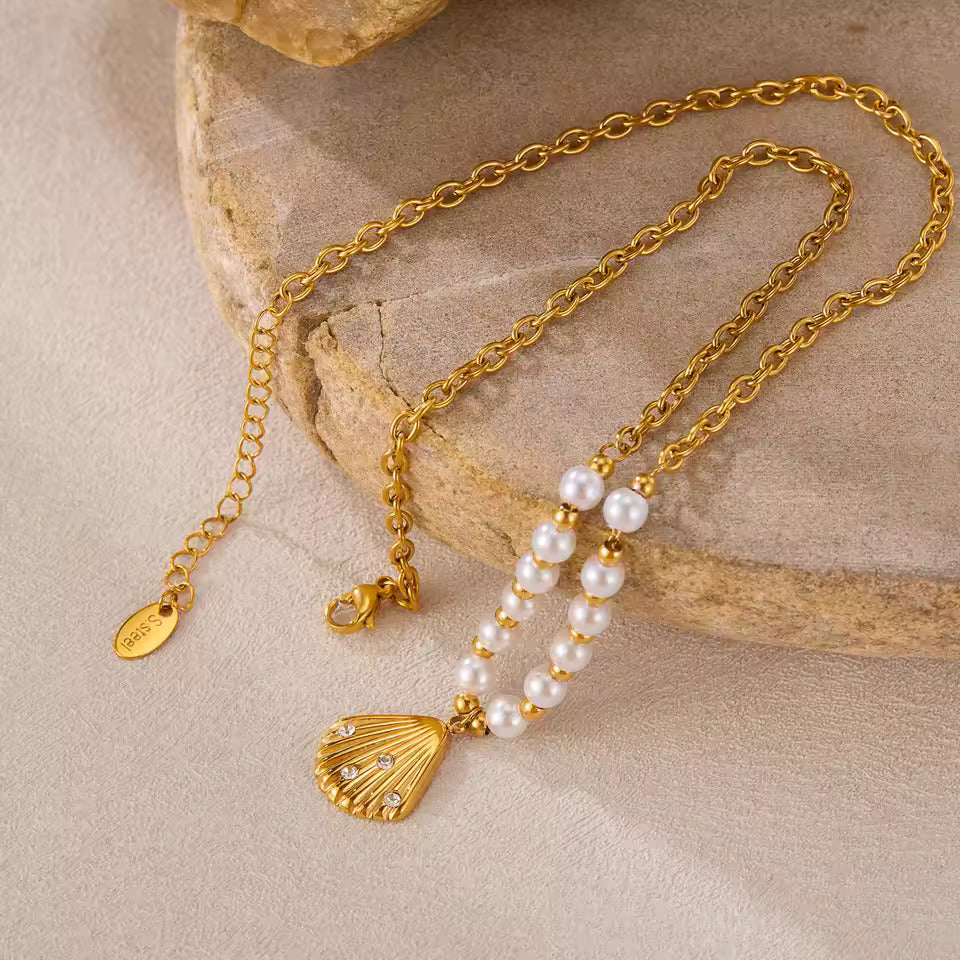 Each piece is delicately crafted from premium alloy, combining a smooth pearl chain with crystal-studded shell pendants that shimmer like sea foam under sunlight. Perfect for those who carry the serenity of the sea wherever they go.