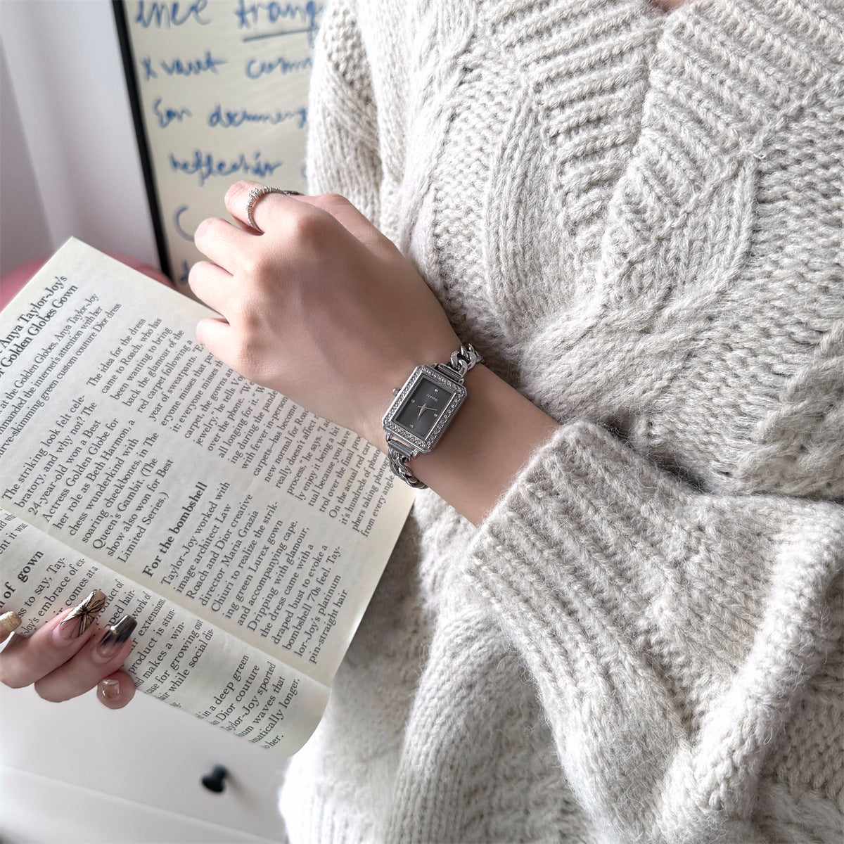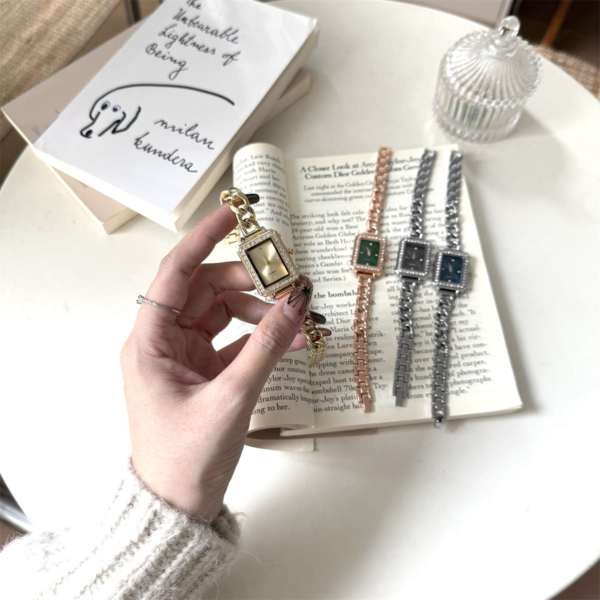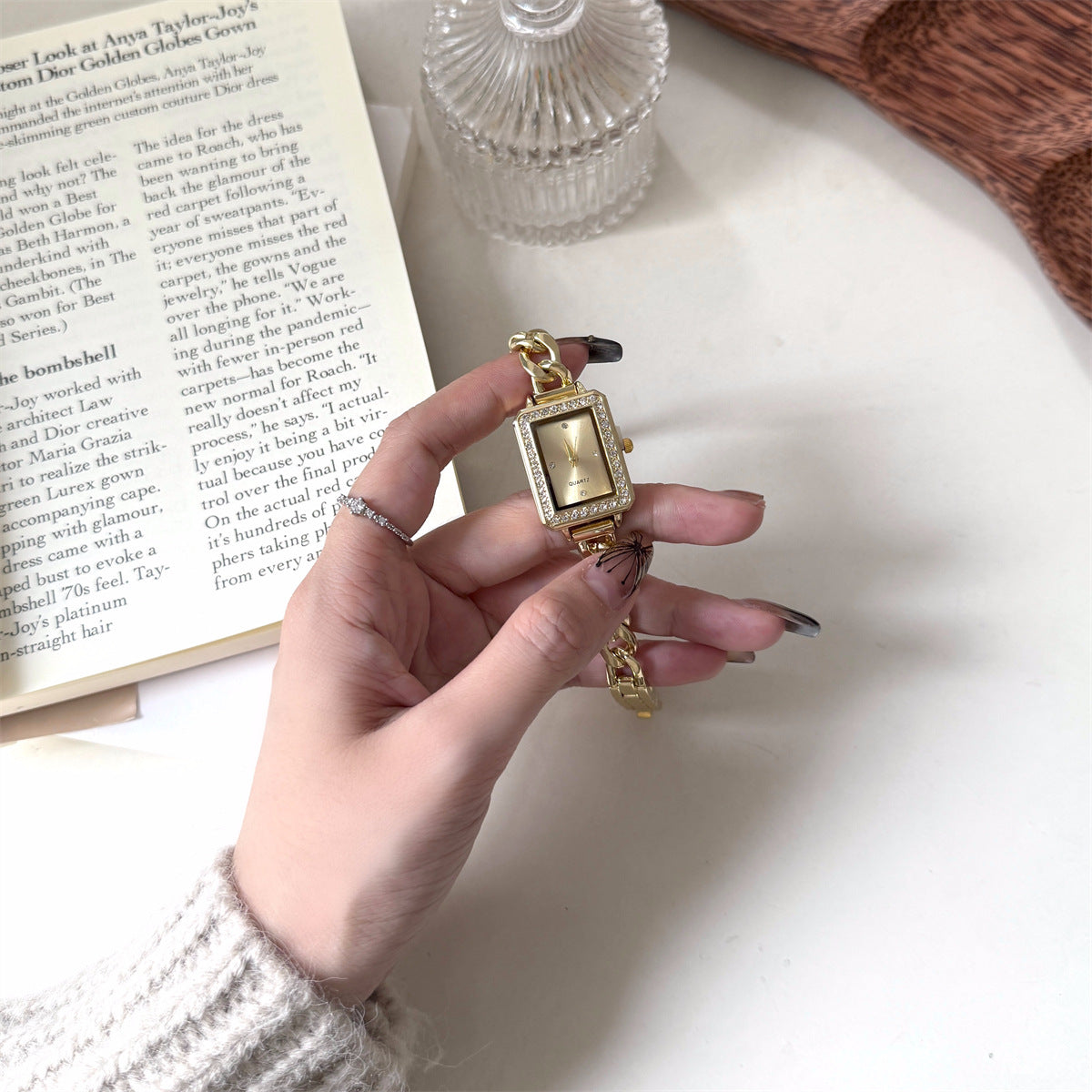 The TimeLace Royale combines the sophistication of a jewelry bracelet with the timeless charm of a vintage watch. Its rectangular gold-tone dial, framed with delicate zircon accents, glows beneath a plain glass mirror, while the spiral crown adds a classic touch. Made from durable alloy and stainless steel, this watch is both chic and enduring — a perfect match for modern queens who value timeless detail.