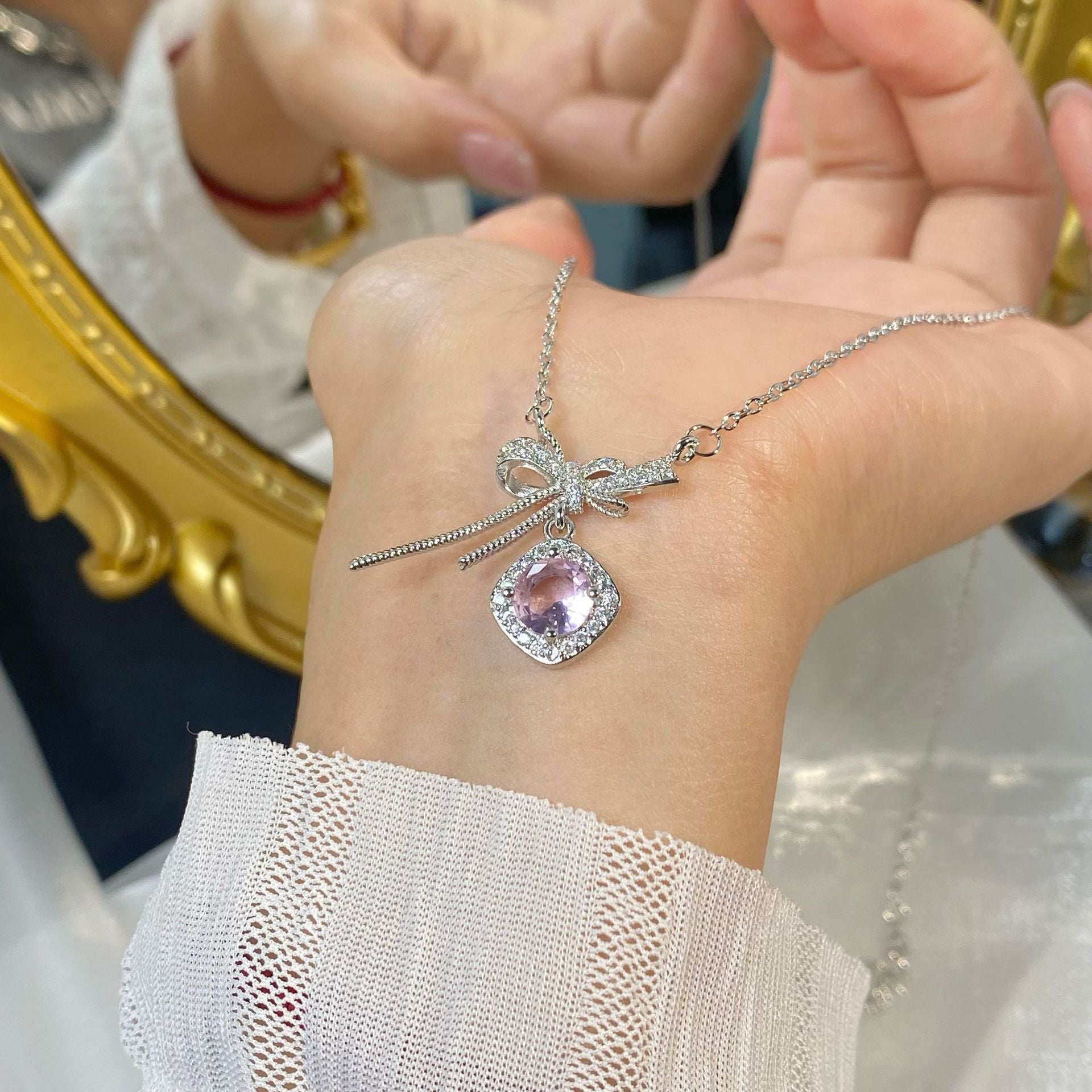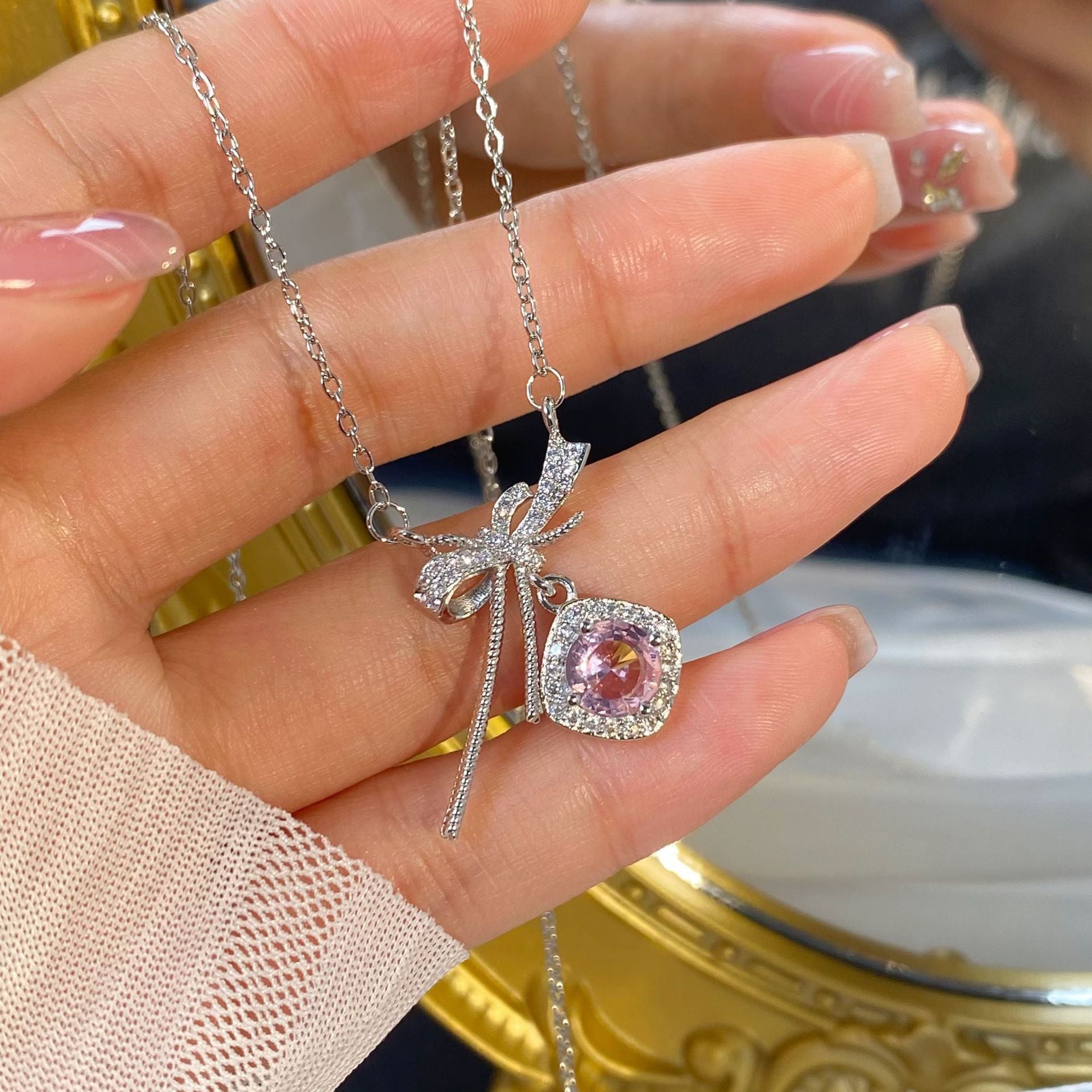 The Twinkie Bow Necklace captures a dreamy balance of femininity and charm, featuring a delicate ribbon-shaped pendant adorned with micro zircons that shimmer like starlight. Below it dangles a blush-pink crystal, glowing with a soft twilight hue β graceful, tender, and timeless.