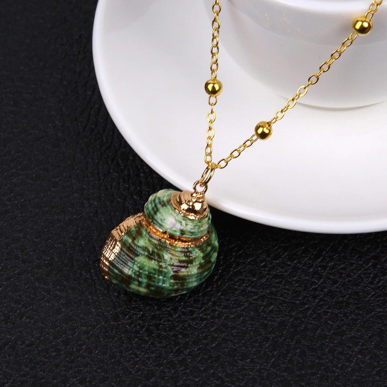 The Verdant Wave Necklace features a natural-inspired shell pendant in marbled green hues, framed by a gleaming gold edge and suspended on a polished link chain. Crafted from premium alloy, it captures the organic beauty of sea treasures with a modern touch of sophistication.