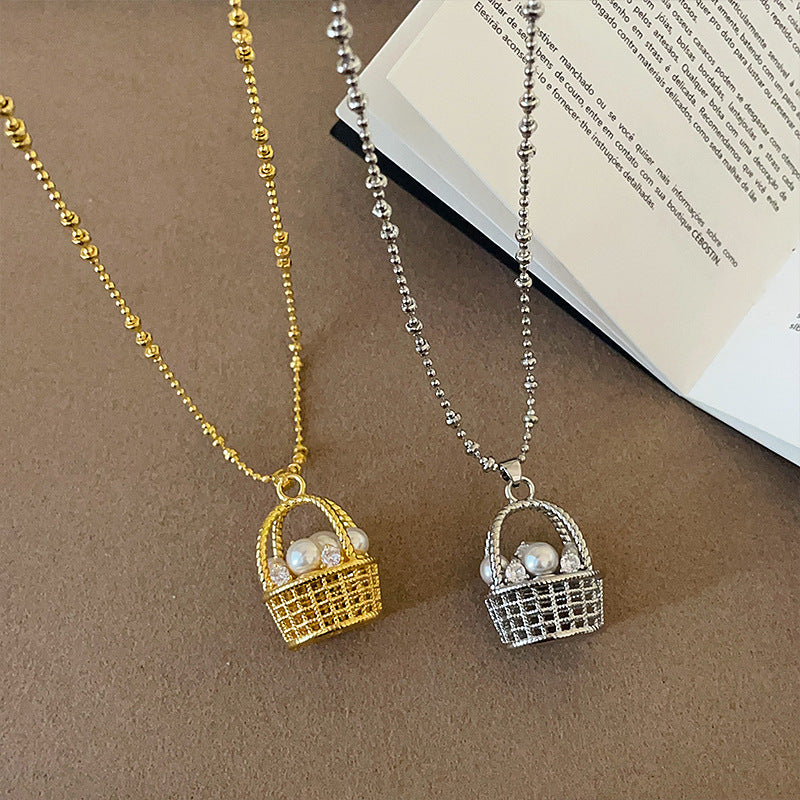 The Vintage Pearl Basket Necklace captures timeless charm in a handcrafted miniature basket pendant filled with lustrous mother-of-pearl beads and micro zircon accents. Each detail reflects classic artistry — from its woven gold plating to the dainty pearl arrangement that evokes vintage romance and soft luxury.