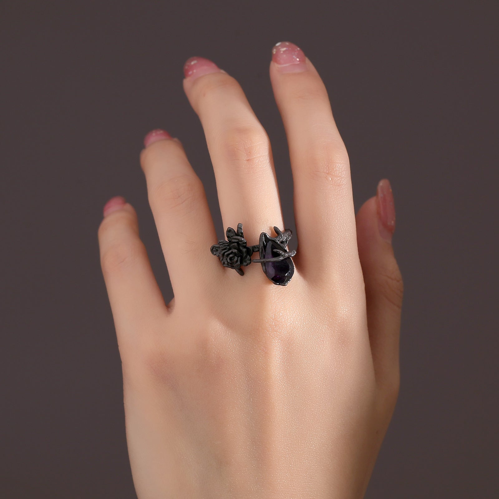 The Violet Thorns Ring entwines a blooming black rose with a violet teardrop crystal, symbolizing passion and mystery in perfect harmony. Handcrafted in zinc alloy, this adjustable piece blends gothic charm with royal elegance — made for the one who dares to bloom through the storm.