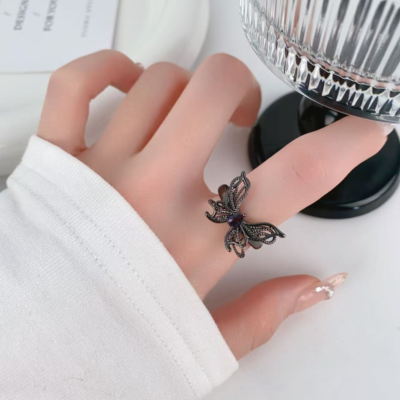 Bold. Mysterious. Mesmerizing. The Wings of Abyss Ring captures the essence of gothic beauty with a modern twist. Crafted in gunmetal black alloy, its sculpted butterfly wings curve dramatically around a lavender-purple zircon stone, symbolizing transformation through shadow and light.